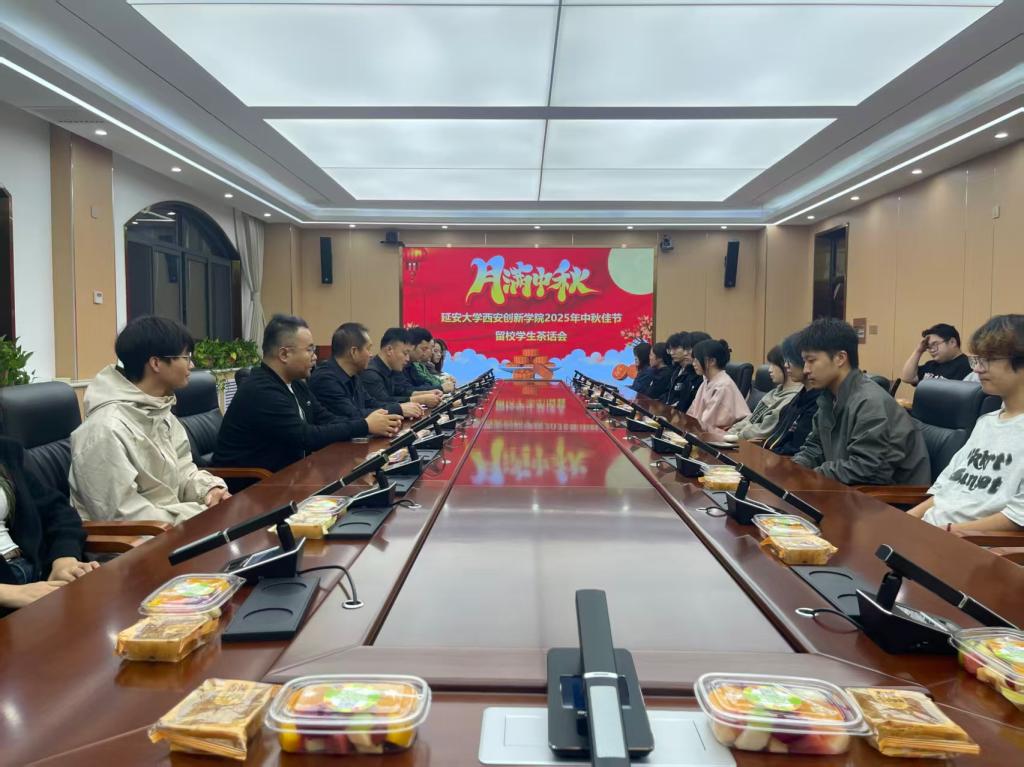 金秋送爽,丹桂飘香。2025年10月6日中秋佳节,为缓解留校学生的思乡之情,营造温馨节日氛围,学生处与校团委精心组织了以“月满创新,情暖校园”为主题的中秋茶话会。副校长王文发、学生处处长赵双勇、校团委副书记马林锐、公寓管理中心副主任刘帅、值班辅导员史丰瑞与王丹与三十余名留校学生代表齐聚一堂,品月饼、话家常、共庆团圆。活动由刘帅主持。