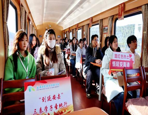 11月22日上午,我校师生乘坐研学专列向红色圣地延安进发。在研学专列上,赵玥结合革命先辈在延安时期的奋斗历程,深入阐释了延安精神的内涵。师生们围绕精神传承热烈互动、各抒己见,在思想碰撞中深化理解,氛围热烈而欢快。