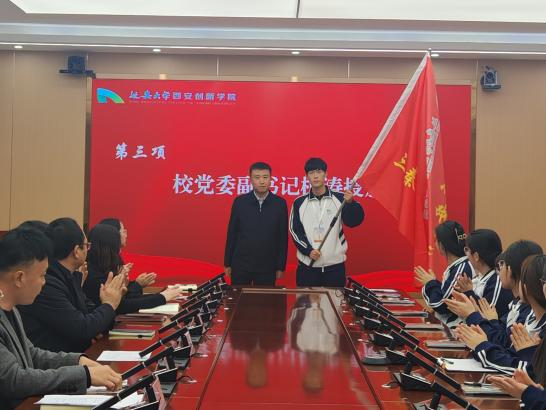 11月20日下午,学校在多功能会议室举行“到延安去”·三秦学子圣地行活动启动仪式。学生处副处长张亮宣读了《延安大学西安创新学院“到延安去”·三秦学子圣地行工作方案》,对首批研学实践活动进行了安排部署。杭涛为研学实践团授旗。数据科学与工程学院计科2203班严寒松作为学生代表接过研学实践团队旗,并作表态发言。全体学子庄严宣誓:“传承延安精神,锤炼过硬本领,争做时代新人”。