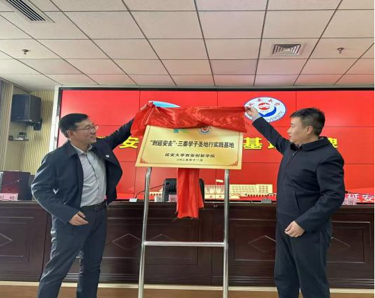 “到延安去”·三秦学子圣地行研学开班暨实践基地挂牌仪式在泽东青年干部学校第六会议室举行。延安大学泽东青年干部学校副校长杜宪增和我校党委副书记杭涛共同出席并为实践基地揭牌。